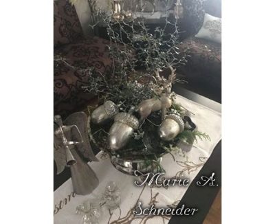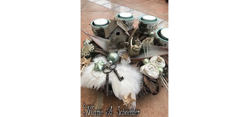 Ich erwähnte es schon öfter, hier seht ihr noch einmal, wie wichtig die Sammelwut ist. Dinge, die auf den ersten Blick gar nicht zusammengehören, sind hier zu tollen Adventskränzen vereint worden. Eine große silberne Schale, in der sicher einmal eisgekühlte Sektflaschen ihren Platz hatten, dient heute als tolle Basis für ein Gesteck. Statt der fluffigen Engelsflügel, die Marie eingesetzt hat, könnt ihr auch Engelsflügel aus Notenblättern nehmen.
