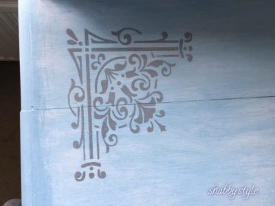 Da mir die obere Platte im Verhältnis zu der Front der Anrichte zu schlicht war, habe ich hier Ornamente von Schablonen getupft. Auch wenn ich die Fläche zu eintönig fand, sollte kein großer Farbunterschied oder eine knallbunte Oberfläche entstehen. Also habe ich eine hochwertige Silberfarbe für die Ornamente genutzt. Dieser Ton ist nicht zu aufdringlich und veredelt die Anrichte zusätzlich.