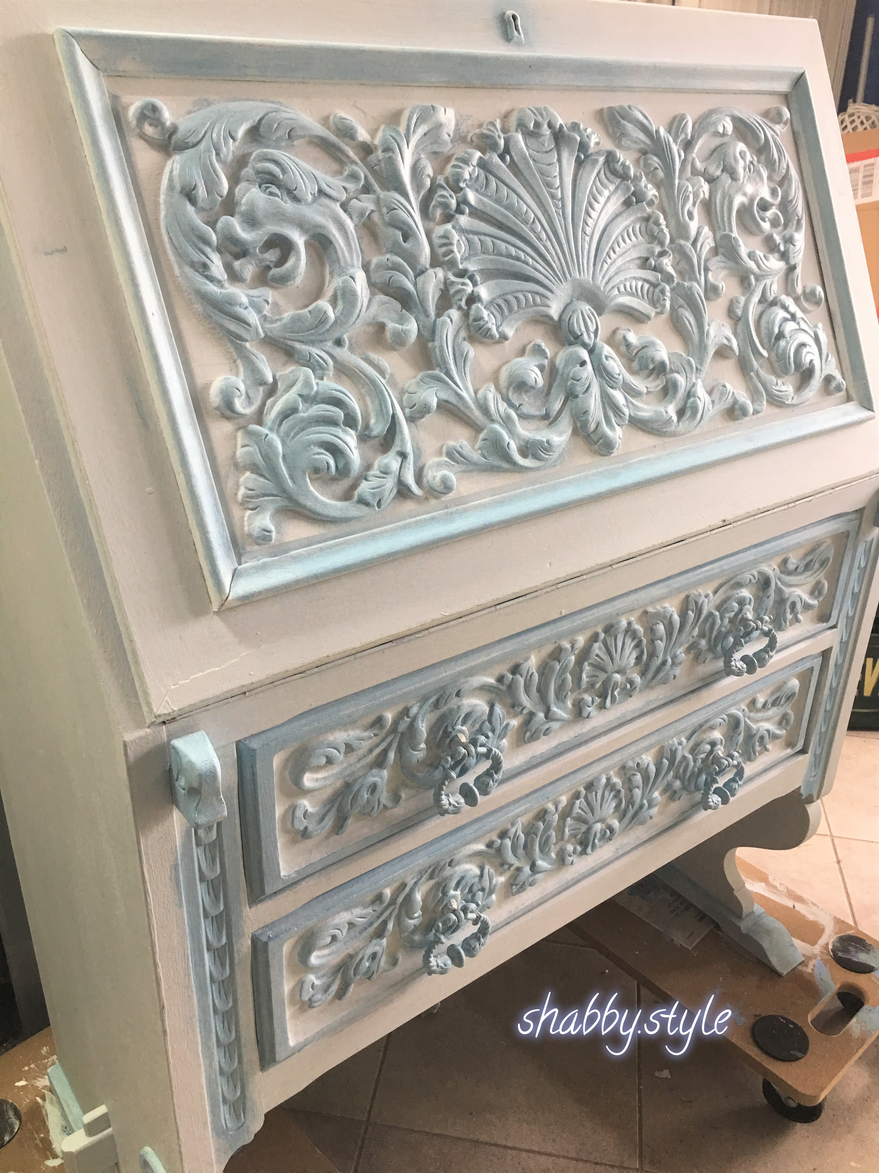 Sekretär mit opulenter Schnitzerei im hellblauen Shabby Style