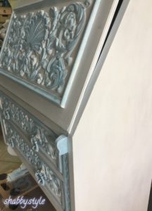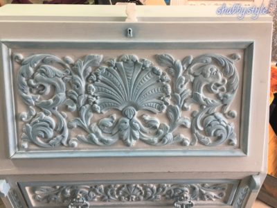 Die Schnitzereien aus massivem Eichenholz auf der Klappe und den Schubladen habe ich bei diesem Sekretär noch mit hellblauem Wachs hervorgehoben, das ein wenig stärker im Farbton ist als die Kreidefarbe. Zum Abschluss habe ich den hellblauen Sekretär noch mit einem farblosen Wachs versiegelt.